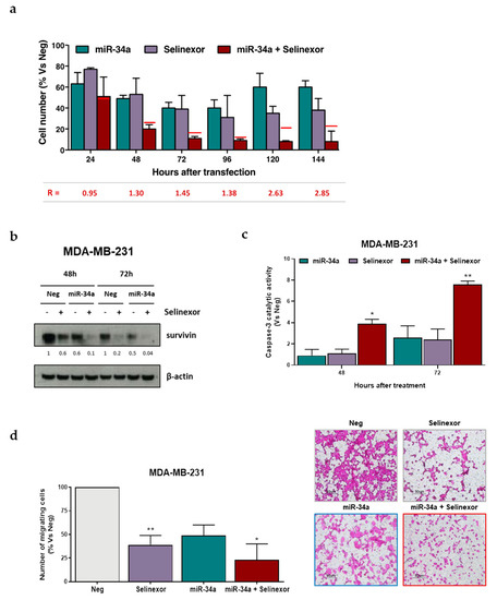 Interestingly, when miR-34a-reconstituted MDA-MB-231 cells were exposed to selinexor, it was found the miRNA synergistically cooperated with the XPO1 inhibitor to reduce cell growth (Figure 5a). The extent of the synergistic interaction increased over time, with the synergistic ratio (R) ranging from 1.3 at 48 h to 2.85 at 144 h (Figure 5a). miR-34a ectopic expression and selinexor concurred in inhibiting survivin protein expression (Figure 5b), which was accompanied by a significant time-dependent increase in caspase-3 catalytic activity, as determined in vitro by the hydrolysis of the specific synthetic substrate (Figure 5c). In addition, the combined treatment induced a greater inhibition of cell migratory capability, as detected in a migration assay, compared to that observed after miR-34a ectopic expression or selinexor exposure (Figure 5d).