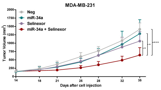 Preclinical data generated in the present study form a solid foundation for promoting the clinical use of a miR-34a-based approach to improve the therapeutic efficacy of selinexor in TNBC patients. However, a major constraint towards translating miRNA-based strategies into human cancer therapy is related to the need for safe and efficient delivery systems. In this context, in 2013, a miR-34a mimic encapsulated in lipid nanoparticles (MRX34) entered a multicentre Phase I study in patients with advanced solid tumors showing evidence of activity in a subset of patients. However, the study was closed early due to serious immune-mediated adverse events [32]. Other miR-34a delivery systems have been proposed [17,29], and some of them have been evaluated in TNBC in vitro models, including photoresponsive gold nanoshells [33] and layer-by-layer assembled poly(lactic-co-glycolic acid) nanoparticles [34]. Both delivery approaches yielded robust suppression of miR-34a targets, which was accompanied by reduced cell proliferation. However, no in vivo data are currently available.