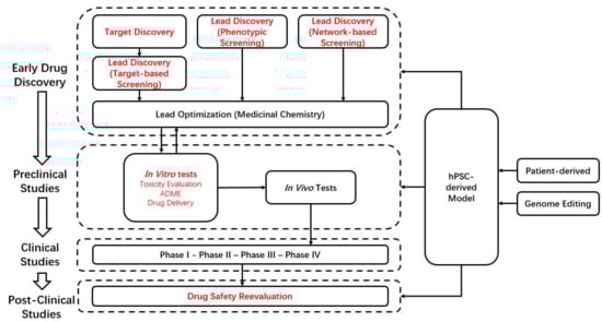 Owing to the capability of unlimited self-renewal and differentiating into any human somatic cells, hPSCs have great potential to build in vitro models for drug discovery and development. hPSC-derived in vitro models, either directly from patients or modified by genome editing technology, can improve the cost-effectiveness and the success rate of drug discovery and development. These models play an active role in phenotypic screening, target-based screening, network-based screening, and post-clinical studies for disease mechanism, drug development, rational drug use, and drug safety re-evaluation.