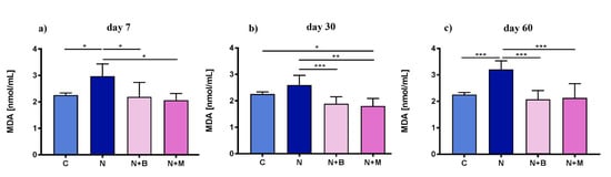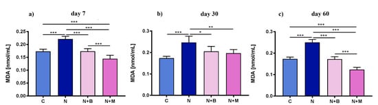 Content of malondialdehyde (MDA) in plasma under acoustic stress conditions after 7, 30, and 60 days. Animals (n = 6) were exposed for 60 days to noise (N) or left untreated (C). Mesedin (M) and beditin (B) were injected daily i.p. to the rats exposed to chronic noise (N + M and N + B, respectively). One-way ANOVA with Sidak’s multiple comparison test, * p < 0.05, ** p < 0.01, *** p < 0.001. The mean ± SEM values of plasma content of MDA on days 7, 30, and 60 after exposure of noise and mesedin/beditin are shown in (a), (b), and (c), respectively.