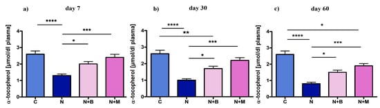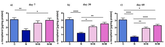As shown in Figure 3, the level of α-T in plasma was significantly lower under chronic acoustic stress conditions at days 7, 30, and 60 in comparison to the untreated control (Figure 3a–c). α2-adrenoblockers were capable of alleviating the oxidative response to noise exposure reflected by a higher level of α-T in beditin- and mesedin-treated groups than that of the noise-treated controls (Figure 3a–c).