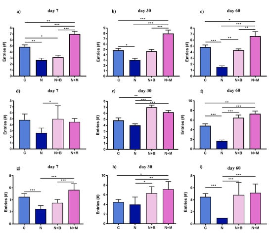 Number of entries to the A–C zones in a Y-maze. Animals (n = 6) were treated for 60 days with noise (N) or left untreated (C). Mesedin (M) and beditin (B) were injected daily i.p. to the rats exposed to chronic noise (N + M and N + B, respectively). One-way ANOVA with Sidak’s multiple comparison test, * p < 0.05, ** p < 0.01, *** p < 0.001. The mean ± SEM values of number of entries to the A zone on days 7, 30, and 60 of noise exposure and mesedin/beditin are shown in (a), (b), and (c), respectively. The mean ± SEM values of number of entries to the B zone on days 7, 30, and 60 of noise exposure and mesedin/beditin are shown in (d), (e), and (f), respectively. The mean ± SEM values of number of entries to the C zone on days 7, 30, and 60 of noise exposure and mesedin/beditin are shown in (g), (h), and (i), respectively.