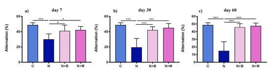 Percentage of alternation in Y-maze. Animals (n = 6) were treated for 60 days with (N) noise or left untreated (C). Mesedin (M) and beditin (B) were injected daily i.p. to the rats exposed to chronic noise (N + M and N + B, respectively). One-way ANOVA with Sidak’s multiple comparison test, * p < 0.05, *** p < 0.001. The mean ± SEM values of percentage of alternations on days 7, 30, and 60 of noise exposure and mesedin/beditin are shown in (a), (b), and (c), respectively.