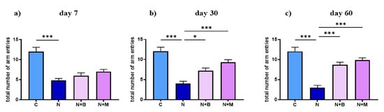 Total number of entries in Y-maze. Animals (n = 6) were treated for 60 days with noise (N) or left untreated (C). Mesedin (M) and beditin (B) were injected daily i.p. to the rats exposed to chronic noise (N + M and N + B, respectively). One-way ANOVA with Sidak’s multiple comparison test, * p < 0.05, *** p < 0.001. Total number of entries reflecting the mobile episodes on days 7, 30, and 60 of noise exposure and mesedin/beditin are shown in (a), (b), and (c), respectively. Data are shown as mean ± SEM.