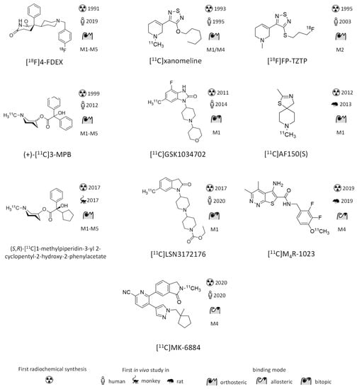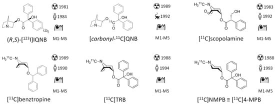 - Eckelman, W.C. Imaging of Muscarinic Receptors in the Central Nervous System. Curr. Pharm. Des. 2006, 12, 3901–3913. [Google Scholar] [CrossRef]