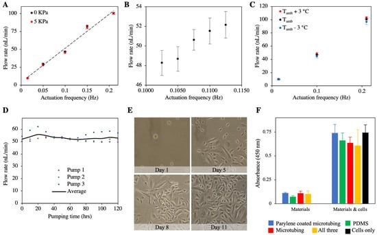 (A) Benchtop characterization of the micropump showed a linear (R2 = 0.98) relation between the actuation frequency and the flow rate, indicating effective control over the flow rate. The application of 5 kPa backpressure did not significantly change the flow rate. Error bars: standard deviation. (B) The micropump had a 2.35 nL/min resolution in delivering at the target flow rate of 50 nL/min. Error bars: standard deviation. (C) A ±3°C fluctuation in the ambient temperature had an insignificant impact on the flow rate. Error bars: standard deviation (D) The micropump could provide a consistent flow rate for 120 h after stabilization, with an average of 53.1 ± 1.8 nL/min (mean ± standard deviation), with fluctuations smaller than 5%. (E) In vivo biocompatibility experiments of the micropump components showed an increase in the numbers of proliferating cells and normal development of cell morphology over time. (F) Results of XTT assays with 120 min incubation time at Day 7 showed insignificant between-group differences for cell health, biocompatibility, and viability for any of the micropump component conditions, confirming biocompatibility of the micropump components. Error bars: standard error of the mean. (A–C,E,F) adapted from [].