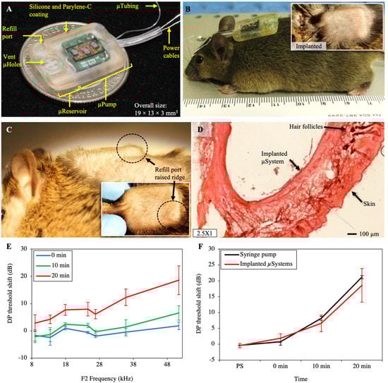 (A) Photograph of a completed microsystem with a 10 µL microreservoir and a micropump working in the range of 10–100 nL/min. This configuration of the microsystem was optimized for subcutaneous implantation in mice with an overall thickness of 3 mm. (B) Photograph of a microsystem before implantation demonstrating the width of the microsystem optimized for subcutaneous implantation in mice. Inset: An image of the microsystem after implantation via insertion of the microsystem in a small incision made in the center of the upper back of a mouse. (C) Side view and top view (inset) of a microsystem implanted showing the visibility of the refilling port. (D) A representative 60 µm section of the skin surrounding the microsystem showed no sign of any active inflammatory cells. A fibrotic layer (pink tissue) fully encapsulated the microsystem. (E) DPOAE threshold shifts (mean ± standard error of the mean) from four mice recorded from 0 to 20 min after the start of a salicylate infusion showed a systemic increase in DPOAE thresholds, demonstrating successful delivery of salicylate to the cochlear. (F) Results of the threshold shift (mean ± standard error of the mean) of the most basal region (F2 = 51.4 kHz) for implanted microsystems and the syringe pump showed perfect consistency, demonstrating the successful performance of the microsystem (n = 6 for syringe pumps, n = 4 for microsystems). PS: post surgery; 0 min: right after starting the pump; 10 and 20 min: 10 and 20 min after starting the infusion.