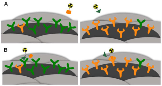 Schematic depiction of the concept of HBPL application exemplified by a comparison of a radiolabeled monospecific (A) or heterobivalent peptidic ligand (B) binding to tumor entities overexpressing different receptor types. In the case of (A), no binding is possible since the respective target receptor is only expressed to a low extent. In the case of (B), the HBPL can bind since at least one of the target receptors is expressed on the tumor surface.
