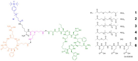 Depiction of the structures of the target HBPLs 1–6 consisting of: a SiFAlin-moiety (blue); a short lysine linker (black); the symmetrically branching framework (pink); linkers Y of different lengths and compositions (PEG1, PEG3, PEG5, PEG8, DIG, Ox-EGEGE; PEG = polyethylene glycol; DIG = diglycolic acid; Ox = oxalic acid); the MC1R- and integrin αvβ3-affine peptides GG-Nle-c(DHfRWK) (green) and c(RGDfK) (orange).
