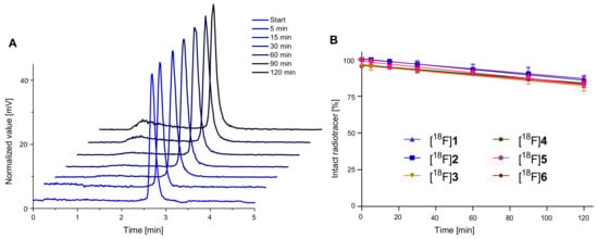 In addition to the investigation of the radiotracers’ lipophilicity, their stability in human serum was evaluated in order to determine possible stability issues of the newly developed agents. For this purpose, the respective 18F-labeled HBPLs were incubated in human serum at 37 °C for 120 min. The results of these experiments are summarized in Table 1, and the corresponding radio-HPLC chromatograms for [18F]2 as representative examples for all compounds studied are depicted in Figure 3A (see Supplementary Materials, Figure S91 for the results obtained for the other radioligands). In Figure 3B, the portions of intact radiotracer over the course of the stability experiments are depicted.