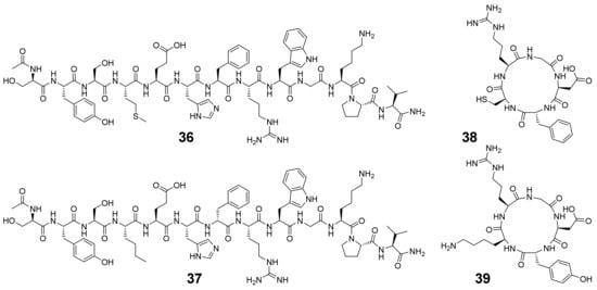 Structures of α-MSH (36), NDP (37), c(RGDfC) (38) and c(RGDyK) (39), which were used as monospecific reference peptides during the competitive displacement studies.