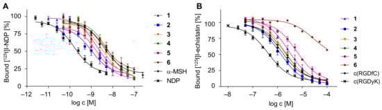 Depiction of the determined binding curves of the HBPLs 1–6, obtained by competitive displacement assays on MC1R-positive B16F10 cells (A) and integrin αvβ3-positive U87MG cells (B). Values are depicted as mean (n = 9); error bars represent SD.