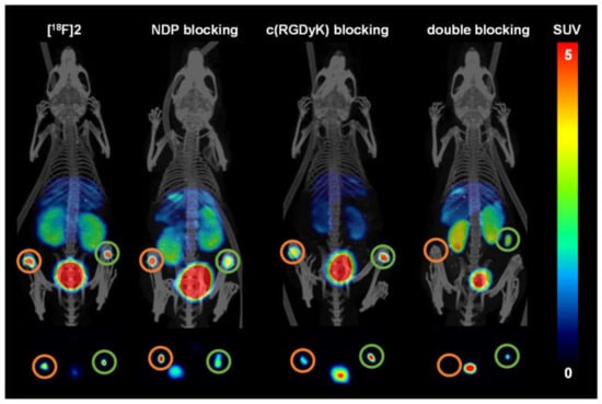 Depiction of the PET/CT images given as maximum intensity projections (MIPs) applying [18F]2 as the radioligand (n = 3 for each group). From left to right: [18F]2 without blocking; NDP blocking; c(RGDfK) blocking; blocking using both agents. Shown are MIPs obtained for 50–90 min PI (post-injection). Upper row: coronal slices; bottom row: transaxial slices at the tumor level. Circled in orange: U87MG tumors; circled in green: B16F10 tumors.