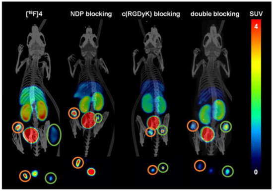 Depiction of the PET/CT images given as MIPs applying [18F]4 as the radioligand (n = 3 for each group). From left to right: [18F]4 without blocking; NDP blocking; c(RGDfK) blocking; blocking using both agents. Shown are MIPs obtained for 50–90 min PI (post-injection). Upper row: coronal slices; bottom row: transaxial slices at tumor level. Circled in orange: U87MG tumors; circled in green: B16F10 tumors. In the transaxial sections, it was not always possible to depict both tumors as some were out of plane.