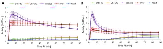 Depiction of the TACs for B16F10 and U87MG tumors, kidneys, liver and heart over 90 min PI for [18F]2 (A) and [18F]4 (B) (n = 3). Values are depicted as mean; error bars represent SD.