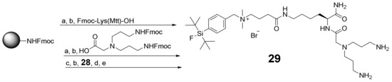 Next, the SiFAlin-comprising symmetrically branching building block 29, being the basis for the following peptide conjugation and thus peptide heterodimer synthesis, was prepared. The branching unit was synthesized on a solid support using the same standard protocols followed for peptide synthesis (Scheme 4). For this purpose, a rink amide resin MBHA LL was first reacted with Fmoc-Lys(Mtt)-OH and N,N-bis[3[3 -(Fmoc-amino)propyl]glycine. After the cleavage of the Mtt-PG under mildly acidic conditions, 28 was conjugated to the framework. After the deprotection and cleavage from the resin, 29 was isolated in overall yields of 43% (for analytical data, see Supplementary Materials Figures S16–S46).