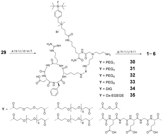 Schematic depiction of the synthesis of the MC1R- and integrin αvβ3-affine HBPLs 1–6. Conditions: (a) 10, DIPEA, DMF, 60% yield for 30; (b) 11, DIPEA, DMF, 67% yield for 31; (c) 12, DIPEA, DMF, 41% yield for 32; (d) 13, DIPEA, DMF, 49% yield for 33; (e) 14, DIPEA, PyBOP, DMF, 46% yield for 34; (f) 15, DIPEA, PyBOP, DMF, 58% yield for 35; (g) 16, DIPEA, DMF, 77% yield for 1; (h) 17, DIPEA, DMF, 66% yield for 2; (i) 18, DIPEA, DMF, 49% yield for 3; (j) 19, DIPEA, DMF, 58% yield for 4; (k) 20, DIPEA, PyBOP, DMF, 24% yield for 5; (l) 21, DIPEA, PyBOP, DMF, 21% yield for 6.