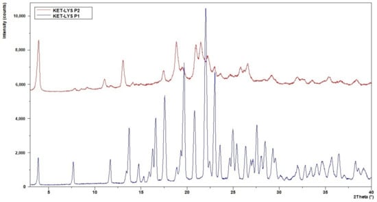 Comparison of XRPD patterns of KET–LYS P1 and KET–LYS P2. The diffraction patterns of KET–LYS P1 and KET–LYS P2 are non-superimposable.