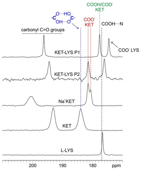 In Figure 2, the C=O regions (170–210 ppm) of the 13C CPMAS spectra of KET, l-LYS, Na+KET−, KET–LYS P1, and KET–LYS P2 are reported. Analyzing the 13C-CPMAS spectrum of KET, a signal is detectable at 184.0 ppm, a high value that is typical and, thus, indicative of a carboxylic group involved in a homodimeric interaction (as is the case for KET, Figure S7, Supplementary Materials) [26]; on the other hand, its sodium salt Na+KET− displays two peaks at 181.4 and 180.5 ppm, which indicate the presence of two independent molecules in the unit cell. Both these chemical shifts are consistent with the unprotonated nature of a carboxylate group (COO−). In the case of KET–LYS P1, we observed two peaks in the carboxylic region, at 174.5 and 177.6 ppm.