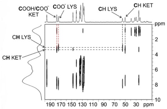 The 13 CPMAS spectrum of KET–LYS P2 was acquired with a Jeol ECZR 600 instrument, operating at 600.17 and 150.91 MHz, respectively, for 1H and 13C nuclei. The powder sample was packed into a cylindrical zirconia rotor with a 3.2 mm o.d. and a 60 μL volume. A certain amount of sample was collected from the batch and used without further preparations to fill the rotor. The 13C CPMAS spectrum was acquired at 273 K, at a spinning speed of 20 kHz, using a ramp cross-polarization pulse sequence with a 90° 1H pulse of 2.19 μs, and a contact time of 3.5 ms. An optimized recycle delay of 6 s was used, for a number of scans of 240. A two-pulse phase modulation (TPPM) decoupling scheme was used, with a radiofrequency field of 108.5 kHz. The 13C chemical shift scale was calibrated through the methylenic signal of external standard glycine (at 43.7 ppm).