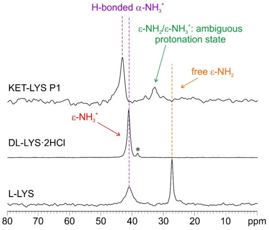To confirm this assumption, we further investigated the system by 15N CPMAS SSNMR analysis, which usually offers the chance to discriminate between deprotonated and protonated N atoms and, thus, in this case, between the NH2 and NH3+ moieties of l-LYS and KET–LYS P1. Figure 4 shows the 15N CPMAS NMR spectra of samples l-LYS, dl-LYS·2HCl, and KET–LYS P1. l-LYS itself contains both types of moieties; its ε-NH2 group, free from HBs (as observable in its crystal structure, Figure S5, Supplementary Materials; see also [28]), resonates at 27.2 ppm, while its α-NH3+ falls at 41.0 ppm. The 15N-CPMAS spectrum of KET–LYS P1 allowed confirming the protonated nature of the α-NH3+ of LYS in KET–LYS P1 (43.0 ppm), and it showed that the ε-N signal falls at 32.8 ppm, which is intermediate between the chemical shifts of α-NH3+ and ε-NH2 of pure l-LYS. Although ambiguous, its chemical shift suggests the presence of a neutral NH2 group involved in HB interactions, i.e., H2N⋯H–X. Indeed, a proper ε-NH3+ signal falls at 41.3 ppm as observed in the spectrum of dl-LYS·2HCl. Thus, it can be said that this system falls in the salt/cocrystal continuum but points more toward a neutral nature, again supporting the concept that the KET–LYS P1 structure is more referable to a cocrystal rather than to a salt.