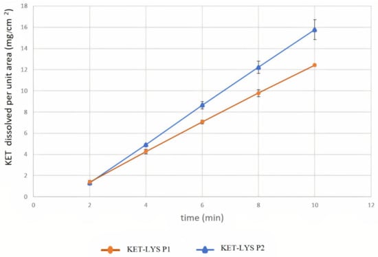 Intrinsic dissolution rates of cocrystal KET–LYS P1 and salt KET–LYS P2. Dissolution profiles of KET from KET–LYS P1 and KET–LYS P2, having constant surface area exposed to the dissolution medium. Three analytical replicates were performed for all the time points. Values are expressed as the mean ± SD.