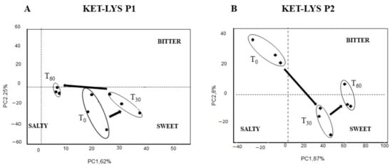 Taste and sensorial kinetic analysis by electronic tongue of cocrystal KET–LYS P1 (A) and salt KET–LYS P2 (B). PCA score plot of KET–LYS P1 and KET–LYS P2 over the time lapsed after dissolution preparation. T0, just solubilized; T30, 30 min in solution; T60, 60 min in solution. PC1: first principal component; PC2: second principal component. Three analytical replicates were performed for all the time points.
