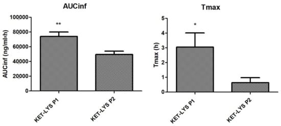 Pharmacokinetics in vivo of cocrystal KET–LYS P1 and salt KET–LYS P2. AUC-inf and Tmax values of KET–LYS P1 and KET–LYS P2. * p < 0.05 and ** p < 0.01. Analyses were performed in n = 6 rats, and values are expressed as the mean ± SEM.