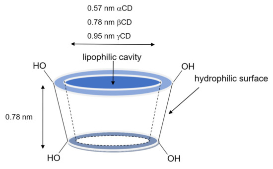 Cyclodextrins are widely used pharmaceutical excipients thanks to their unique properties [1,2]. They are cyclic oligosaccharides composed of different α-D-glucopyranose units, which results in truncated-cone-shaped molecules with a central cavity (Figure 1). The external surface is hydrophilic, while the central cavity is lipophilic and can host suitable-sized guest molecules. The most common naturally occurring cyclodextrins are the α-cyclodextrin (αCD), β-cyclodextrin (βCD) and γ-cyclodextrin (γCD). They differ for the number of glucopyranose units that compose the truncated-cone structure, which can be 6, 7 or 8, and provide different internal lipophilic cavity sizes. In addition to natural cyclodextrins, many chemically modified derivatives are available, which are obtained by substituting some of the hydroxyl groups on the external surface with other functional groups (hydroxypropyl, methyl, triacetyl, etc.) [2,3]. The importance of cyclodextrins in the pharmaceutical field is related to their ability to form inclusion and non-inclusion complexes with a large variety of drugs [1]. This allows favorable changes in the physico-chemical properties of the guest molecule to be achieved, such as increased solubility and bioavailability, controlled dissolution rate, higher stability, and improved organoleptic features [3].