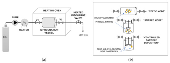 Supercritical solvent impregnation (SSI) techniques are based on the solubilization ability of scCO2 either versus the drug or the cyclodextrin and aim at achieving host-guest complexation at supercritical conditions before depressurization. Figure 2a depicts a simplified scheme of the general SSI batch process. The drug and the cyclodextrin are placed into an impregnation vessel and contacted with scCO2 at constant temperature and pressure for a fixed period (valves V1 and V2 closed). The procedure is terminated by rapid decompression to atmospheric pressure, which involves CO2 gasification and its separation form the obtained complex. The different setups available in the literature differ for the type and operation mode of the impregnation vessel (Figure 2b). The simplest and most used technique is the “static mode”, which consists in placing a physical mixture of the drug and the cyclodextrin at pre-defined molar ratios in the impregnation vessel and in contacting it with scCO2 without any agitation [16,20,21,22,24,37,40,44,45,58,63,64,65,66,67,85,88,95]. This procedure was also named by some authors as supercritical “maturing” or “maturation” process [32,52].