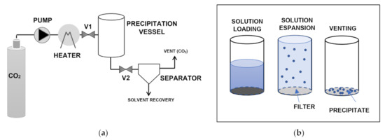 ASES, which is also known as the precipitation with compressed antisolvent (PCA) method, is a semicontinuous process (Figure 4a). This process generally leads to precipitated particles with smaller size and stricter particle size distribution with respect to GAS [105]. ScCO2 is continuously introduced at a fixed flowrate into the precipitation vessel, which is maintained at constant temperature and pressure. Then, the solution is injected into the pressurized vessel at constant flowrate through an atomization nozzle so that supersaturation and the consequent precipitation of solutes are achieved.