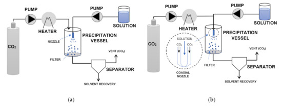 After the solution has been completely delivered, the scCO2 is kept flowing to remove residual solvent while a separator provides CO2/solvent separation. Eventually the particles are collected at the bottom of the vessel after pressure relief [6]. SEDS is a modified version of ASES/PCA (Figure 4b). The main difference lies in the atomization device, which consists in a coaxial nozzle that provides the simultaneous introduction of the solution and the supercritical solvent [6]. This involves a tangential impact between the two fluids, which promotes better mixing so leading to the production of finer powders and preventing particle aggregation [6,105].