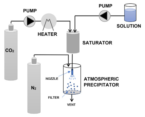 GAS is a batch process whose simplified scheme is reported in Figure 3. First, the liquid solution containing the drug and carrier is loaded in the precipitation vessel. Liquid CO2 is then pumped and heated up to the selected supercritical conditions through valve V1 (valve V2 is closed). During pressurization, the liquid in the precipitation vessel is expanded, supersaturation is achieved, and the solutes are precipitated. After, valve V2 is opened, the vessel is depressurized, and a separator allows the solvent to be recovered from the gaseous CO2. Finally, the obtained particles are collected from the filter located at the bottom of the vessel [6].
