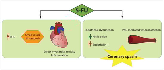 - Dechant, C.; Baur, M.; Bock, R.; Czejka, M.; Podczeck-Schweighofer, A.; Dittrich, C.; Christ, G. Acute Reversible Heart Failure Caused by Coronary Vasoconstriction due to Continuous 5-Fluorouracil Combination Chemotherapy. Case Rep. Oncol. 2012, 5, 296–301. [Google Scholar] [CrossRef]