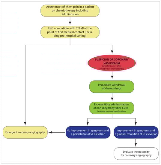 - Redman, J.M.; Rhea, L.P.; Brofferio, A.; Whelpley, M.; Gulley, J.L.; Gatti-Mays, M.E.; McMahon, S.; Cordes, L.M.; Strauss, J. Successful 5-fluorouracil (5-FU) infusion re-challenge in a metastatic colorectal cancer patient with coronary artery disease who experienced symptoms consistent with coronary vasospasm during first 5-FU infusion. J. Gastrointest. Oncol. 2019, 10, 1010–1014. [Google Scholar] [CrossRef] [PubMed]