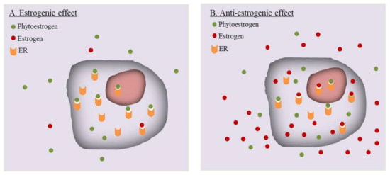 Review of published data often leads to a paradox regarding the estrogenic or anti-estrogenic effects of phytoestrogens. Apparently inconsistent or even completely opposite results have been reported for the same type of phytoestrogen by different laboratories. While some discrepancies could be explained by the purity of the compounds used in experiments [46], others, especially those opposite results, may be caused by an intrinsic reason. The ovary, adipose and muscles produce a large amount of endogenous estrogens, and the endometrial tissue also locally synthesizes estrogens [103]. Phytoestrogens absorbed through food digestion would reach the eutopic as well as ectopic endometrium. As illustrated in Figure 1, the exogenous phytoestrogens and endogenous estrogens will competitively bind to the same ER molecules to exert their activities. The effect of a phytoestrogen compound would be largely determined by its competition with the preexisting endogenous estrogens upon binding to ER. Thus, the levels of endogenous estrogen becomes an important denominator for the actions of phytoestrogens.