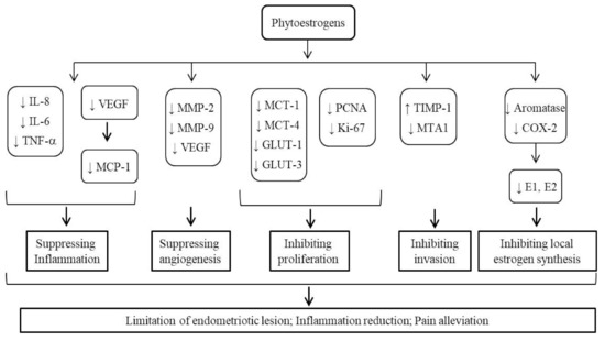 Regarding the quantification methods, since phytoestrogens come from a variety of foods, the questionnaire survey only provides a rough estimation of consumption [59,60]. Also, the absorption efficiency and metabolism of these compounds is quite different among individuals, introducing further variations. The direct measurement of circulatory or urine phytoestrogen levels has its advantage [42,59,60]. However, to be relevant to endometriosis, phytoestrogens need to reach the eutopic/ectopic endometrial targets. From this point of view, local levels of phytoestrogens, e.g., in endometrial tissues, become a critical factor. The quantitative relationship among consumption, serum and urine levels, and local levels of phytoestrogens should be investigated in future studies.
