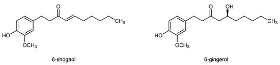 - Sang, S.; Hong, J.; Wu, H.; Liu, J.; Yang, C.S.; Pan, M.H.; Badmaev, V.; Ho, C.T. Increased growth inhibitory effects on human cancer cells and anti-inflammatory potency of shogaols from zingiber officinale relative to gingerols. J. Agric. Food Chem. 2009, 57, 10645–10650. [Google Scholar] [CrossRef] [PubMed]