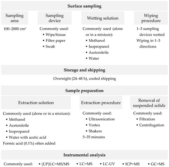 A schematic representation of the main considerations for the development of an analytical methodology to monitor the contamination of surfaces by cytostatics, which are discussed in the next subsections, is shown in Figure 1.