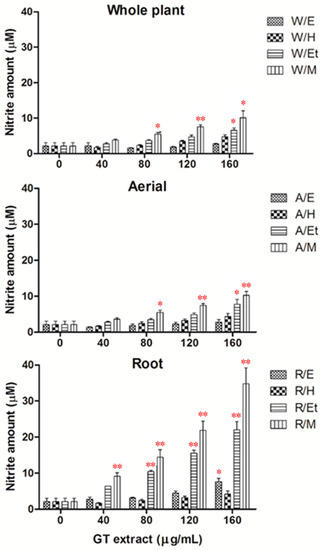 Effects of different extracts from the whole plant, aerial and root of GT on NO production in HUVECs. HUVECs were treated with each extract for 24 h. NO production was determined as the formation of nitrite. Data were obtained from five replicate experiments, and are expressed as mean ± standard deviation. W, whole plant; A, aerial; R, root; E, EA extract; H, hexane extract; Et, ethanol extract; M, methanol extract. A significant difference from the vehicle was indicated as * p < 0.05, ** p < 0.01, (Student’s t-test).