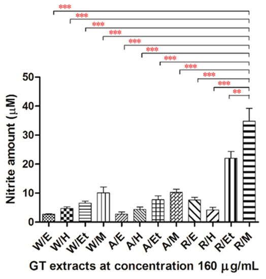 One-way ANOVA analysis and post-hoc analysis for NO production on various extracts. HUVECs were treated with each extract for 24 h. NO production was determined as the formation of nitrite. Data were obtained from five replicate experiments, and are expressed as mean ± standard deviation. W, whole plant; A, aerial; R, root; E, EA extract; H, hexane extract; Et, ethanol extract; M, methanol extract. A significant difference was indicated as ** p < 0.01 or *** p < 0.001.