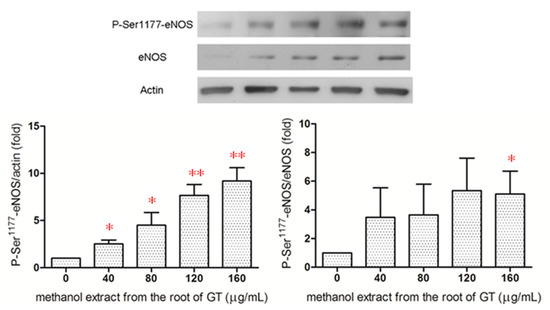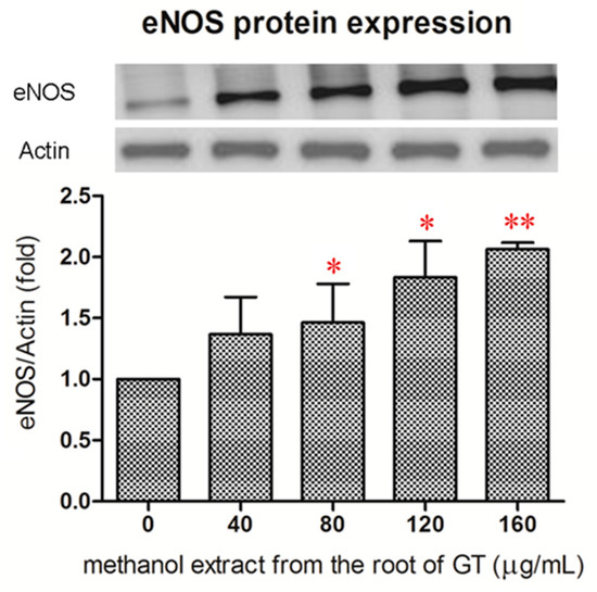 Since the R/M GTE exhibited the most potent effect on NO production, we then examined if the R/M GTE increased the expression of eNOS. As analyzed with Western blot, treatment of HUVECs with R/M GTE for 24 h resulted in a significant increase in eNOS protein expression at a dose higher than 80 μg/mL (Figure 3).