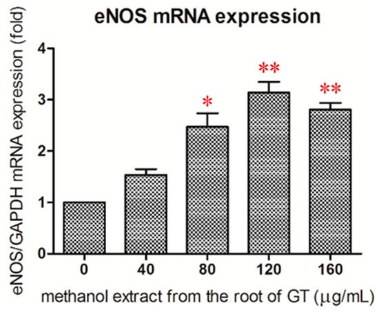 Effect of R/M GTE on eNOS mRNA expression in HUVECs. HUVECs were treated with R/M extract for 24 h. Real-time RT–PCR analysis was performed in order to analyze the expression level of mRNA of eNOS. Data were obtained from triplicate experiments, and are expressed as mean ± standard deviation. A significant difference from the vehicle was indicated as * p < 0.05 or ** p < 0.01 (Student’s t-test).