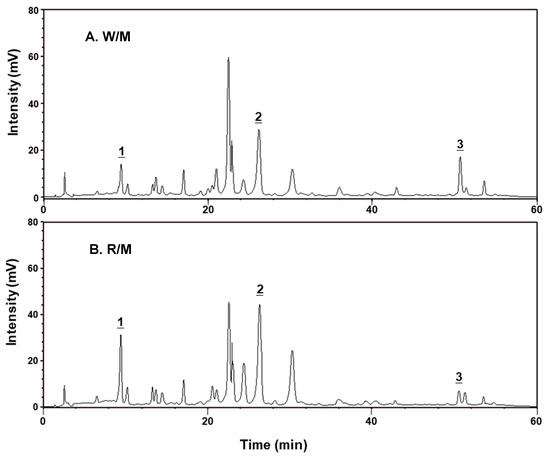 HPLC chromatogram of the W/M GTE (A) and R/M GTE (B). The mobile phase was methanol/0.05% acetic acid (4:6, v/v) with the flow rate of 1.0 mL/min. The detection was performed at 350 nm. Identified components: 1, chlorogenic acid; 2, luteolin-7-glucoside; and 3, luteolin.