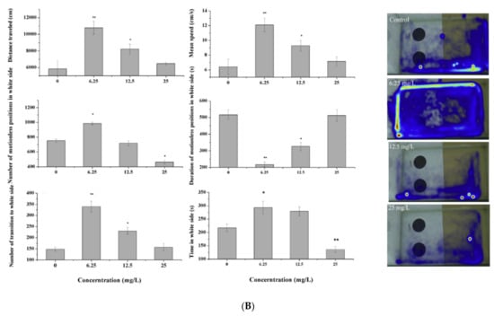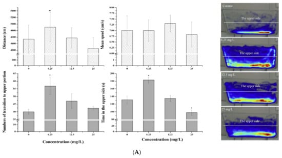 As can be seen in Table 4, few data are available on the effects of antibiotic mixtures using zebrafish as a model organism. Wang and co-workers provided important information concerning the joint effects of β-diketone antibiotic mixture exposure on zebrafish. They demonstrated that the exposure to fluoroquinolones and tetracyclines can induce dysfunction of the immune system, liver and heart; damage the antioxidant defense system; and cause reproductive failure, skeletal disorders and neurotoxicity effects [30,31,35,37,112,113,114]. Briefly, treatments with DKAs affect a variety of cellular and biological processes in zebrafish. It is very interesting to note that only few data are available on the neurotoxicity of antibiotics from the perspective of animal behavior. In a recent study, the effects of DKA chronic exposure on zebrafish behavior were examined by means of a bottom swelling test, conditioned place preference (CPP) and social cohesion using Ethovision XT software Noldus IT, as well as their related molecular mechanisms [28]. The video-tracking analysis revealed that DKA exposure significantly impaired zebrafish swimming, exploratory behavior and social interaction. According to the bottom swelling test, the number of transitions to the upper portion, the time spent in the upper side and the distance traveled by zebrafish exposed to 6.25, 12.5 and 25 mg/L DKA treatments were significantly affected. While zebrafish exposed to 6.25 mg/L of DKAs showed an increased exploratory ability, indicating occurrence of anxiolytic behavior, the 25 mg/L DKA treatment decreased the time spent in the top part of the test tank when compared to the control group, which may be interpreted as an indicator of anxiety-like behavior (Figure 1). The distance traveled was enhanced by 85% and the mean speed by 87% for 6.25 mg/L DKA treatment compared to the control. The zebrafish active levels were prominently decreased with the increase in DKA concentrations from 6.25 mg/L to 25 mg/L. Moreover, an increase of 38% in zebrafish shoaling behavior was observed, which may be due to anxiety-like shoal cohesion or increased sociability, and there was a decrease of 41% in zebrafish social cohesion, possibly due to an autism-like state, for the low DKA concentration. In agreement with behavioral abnormality, the TEM images confirmed that DKA exposure may inhibit the development of primary motor neurons, such as pyknosis of the nucleolus, cavitation of cytoplasm, decreasing the synapse distance and dissolution of filament in axon. In addition, the treatment with the β-diketone antibiotic mixtures led to changes in the transcriptional levels of 11 locomotor-related genes. Similar to those reported previously, Zhang et al. [37] showed that the circadian cycle was disturbed after the exposure of zebrafish to DKAs.
