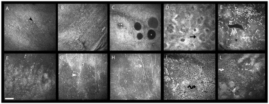 Other epithelial changes found with IVCM are squamous metaplasia, desquamation, keratinization, thickening, subepithelial fibrosis, conjunctiva-associated lymphoid tissue (CALT) activation, dendritic cells’ (DCs) activation, and GCs’ loss [40,41].