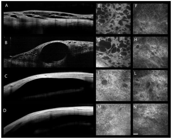 Ciancaglini et al. described at IVCM the presence of epithelial microcysts in the bulbar conjunctiva in untreated ocular hypertension (OH) and in topically treated primary open-angle glaucoma (POAG) patients [38]. A higher microcyst density and area were found in patients on combined β-blocker/prostaglandin therapy when compared with PGA monotherapy, suggesting that combined therapy may enhance the aqueous humor outflow more than monotherapy [38]. Moreover, the authors did not exclude that a higher BAK concentration in the combined therapy could be a contributing factor for the increased epithelial microcysts density and area [38].