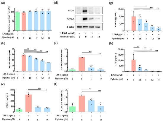 The effects of piplartine on the cell viability, NO and PGE2 production, iNOS and COX-2 expression and TNF-α and IL-6 secretion by LPS-activated J774.1 cells. Cells were pretreated with different concentrations (0–10 μM) of piplartine (1 h) and primed with 1 μg/mL LPS (24 h). (a) Cell viability was detected using MTT assay. (b) NO production was measured using Griess reagent assay. (c) The production of PGE2 was analyzed by ELISA. The expression of COX-2, iNOS and β-Actin (loading control) was determined by Western blotting. Representative images are shown in (d), and the quantified results from three independent experiments are shown in (e,f). The secretions of (g) TNF-α and (h) IL-6 were analyzed using ELISA. Data are presented as means ± SD and the significant differences indicated as * p < 0.05 and *** p < 0.001.
