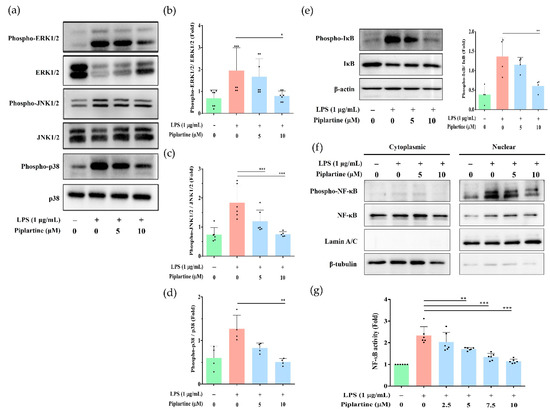 The effects of piplartine on both MAPKs and NF-κB signaling pathways in LPS-activated J774.1 cells. (a) Cells were pretreated with different concentrations (5 and 10 μM) of piplartine (1 h) and primed with 1 μg/mL LPS (2 h). Western blotting was performed to examine MAPK-associated protein expression. Representative results from one of three separate Western blotting experiments are shown, and the quantified results from three independent experiments are shown in (b–d). (e,f) Cells were pretreated with different concentrations (5 and 10 μM) of piplartine (1 h) and primed with 1 μg/mL LPS (30 min). Western blotting was executed to examine IκB protein expression in the cytoplasm and NF-κB protein expression between cytoplasm and nucleus. (g) J-blue cells were pretreated with different concentrations (0–10 μM) of piplartine (1 h) and primed with 1 μg/mL LPS (4 h). SEAP activity in the cell culture supernatant was examined. Data are presented as means ± SD and significant differences indicated as * p < 0.05, ** p < 0.01 and *** p < 0.001.