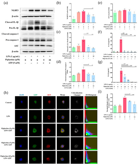 The effects of piplartine on NLRP3 inflammasome activation in macrophages. J774.1 cells were pretreated with different concentrations (0–10 μM) of piplartine (1 h), primed with 1 μg/mL LPS (5 h), and stimulated with 5 mM ATP (30 min). Inflammasome-associated protein expressions were detected using Western blotting, and β-Actin was used as a loading control. Representative images are shown in (a), and the quantified results from three independent experiments are shown in (b–e). (f,g) Cell culture supernatants were collected, and the levels of IL-1β were examined using ELISA. The colocalization of ASC (red) and caspase-1 (green), and DAPI in LPS/ATP-activated J774.1 cells was examined using confocal microscopy and Imaris software for confocal 3D image reconstruction. Representative images from three independent experiments are shown in (h). (i) The quantification of caspase-1 and ASC of colocalizated signals was analyzed using the threshold of the 2D histogram in panel (h) using Mander’s coefficient. Significant differences are indicated as * p < 0.05, ** p < 0.01 and *** p < 0.001.
